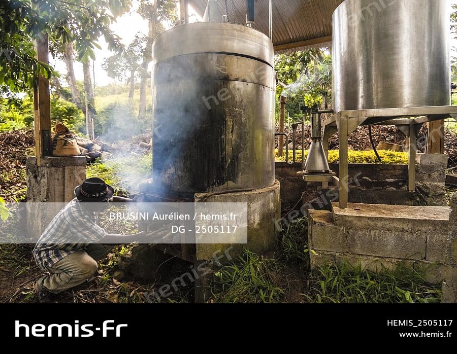 France, Mayotte island (French overseas department), Grande Terre, Combani, essential oil distillation based ylang ylang flower petals (Cananga odorata) in artisan alembic