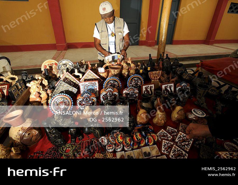 Peru, province of Moche, archaeological site of Huaca del Sol y de la Luna, ceramic seller with reproductions of Mochica mythology