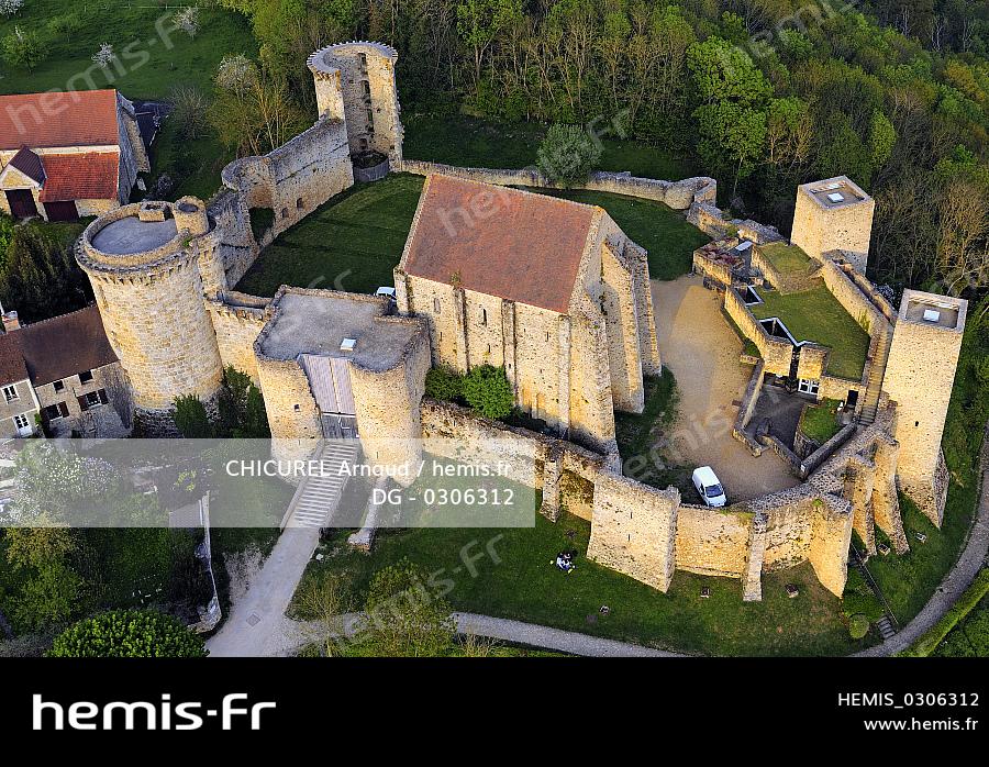 France, Yvelines, parc naturel de la Haute Vallee de Chevreuse (Natural Park of Chevreuse High Valley), Chevreuse village and Chateau de la Madeleine, medieval castle (aerial view)