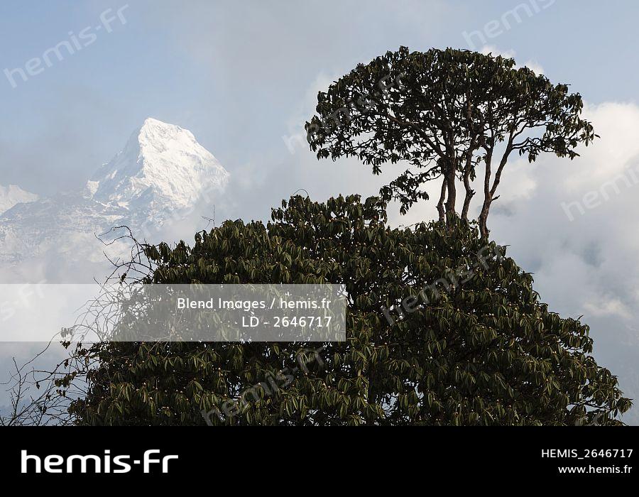 Rhododendron tree in front of Annapurna South peak, Ghorepani, Annapurna District, Nepal