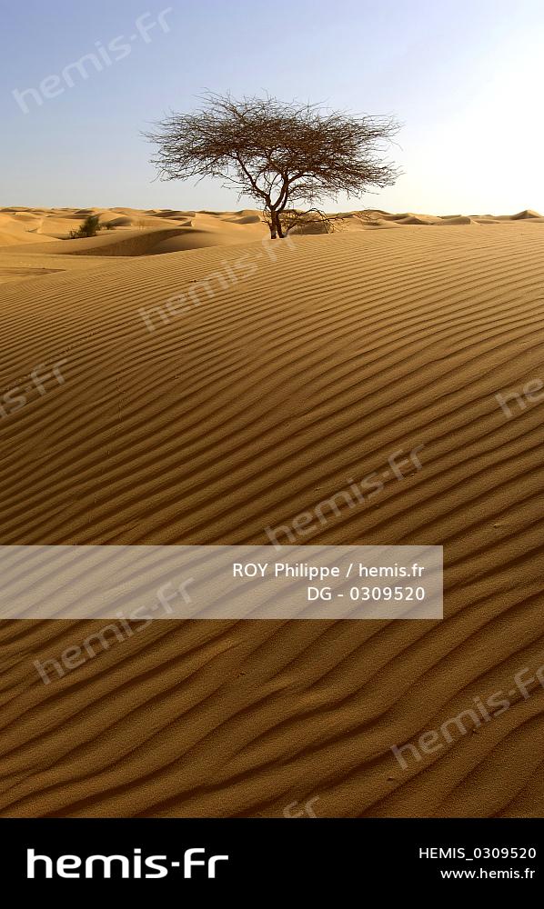 Mauritania, Adrar Region, Akjoujt, acacia tree and landscape of dunes and its vegetation in the desert of Amatlich