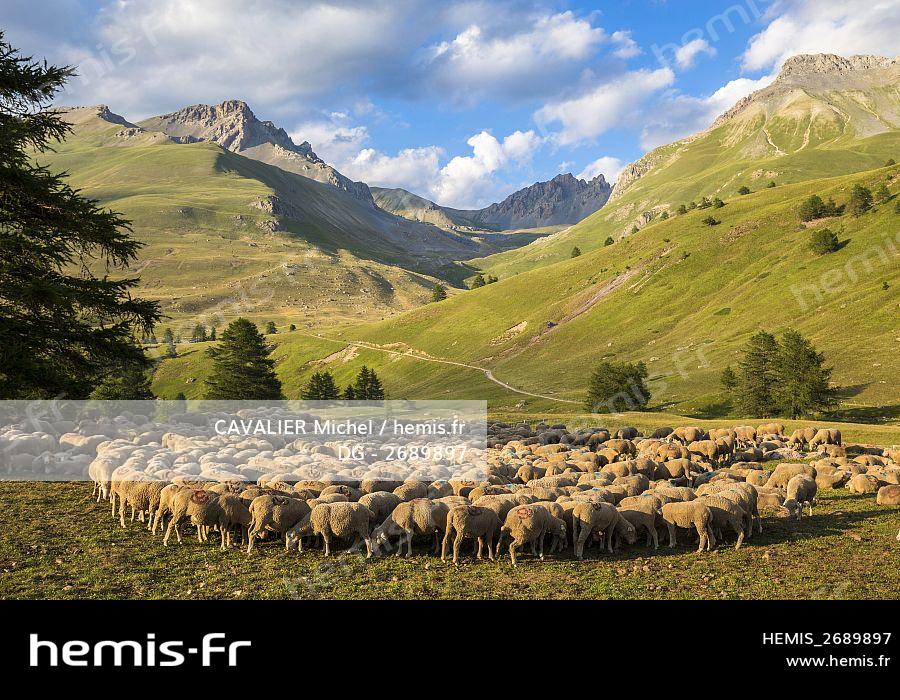 France, Alpes-de-Haute-Provence (04), parc national du Mercantour, Haute-Hubaye, troupeau de mouton dans le vallon de Fourane