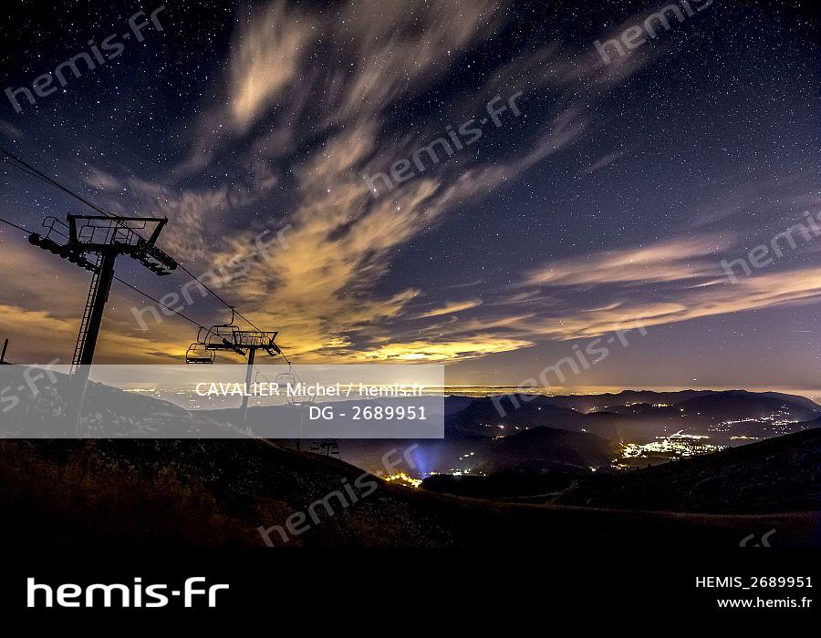 France, Isere, regional natural reserve of Vercors, Corrençon en Vercors, light of the village of Villard de Lans and chairlift of the CLos de la Balme