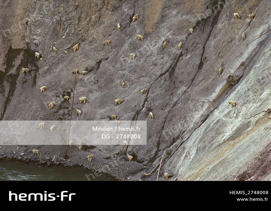 United States, Montana, Rocky Mountains, Glacier National Park, Mountain Goat (Oreamnos americanus), herd licking salt and minerals from steep rocky slope known as Walton Goat Lick