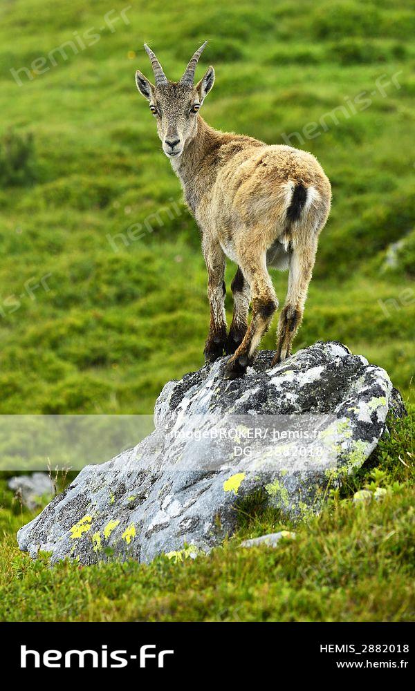 Jeune bouquetin des Alpes - Capra ibex - debout sur un rocher, Oberland bernois, canton de Berne, Suisse, Europe