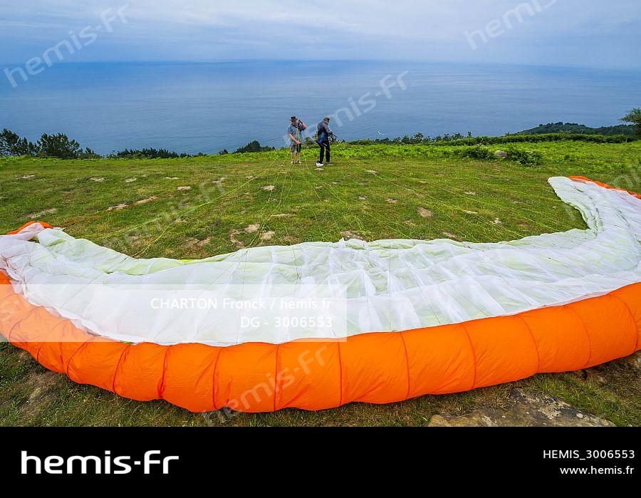 Spain, Basque Country, Guipuzcoa, Orio, paragliding flight from the Monte Barreiatua ,over Antilla beach