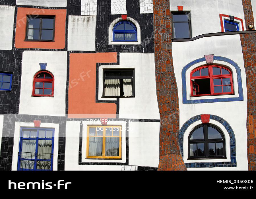 Détail de la façade du Kunsthaus, Art House, bâtiment du complexe thermal et hôtel de Rogner, conçu par Friedensreich Hundertwasser à Bad Blumau, Autriche, Europe