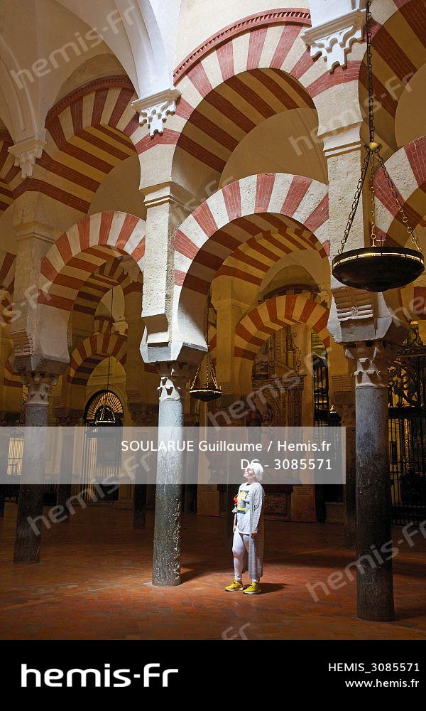 Spain, Andalusia, Cordoba, mezquita, listed as World Heritage by UNESCO, arab tourist in the middle of the columns of the prayer hall of the mosque-cathedral