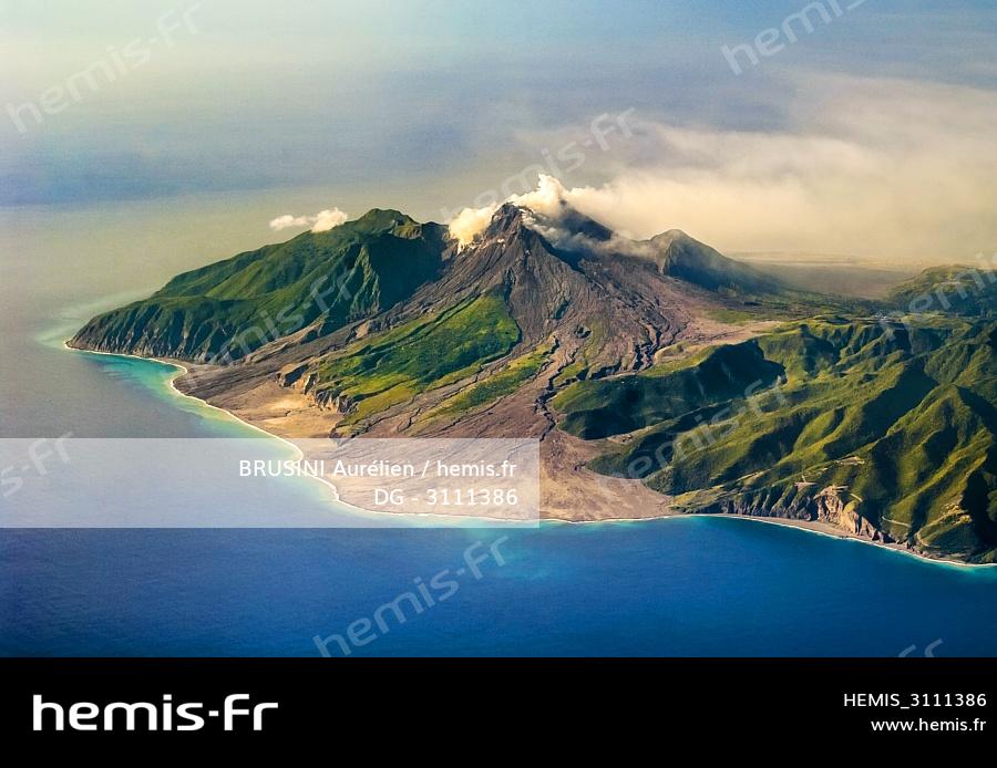 United Kingdom, Montserrat, English-speaking Caribbean, the stratovolcano of the Soufriere Hills (915 m), its pyroclastic flows and its toxic fumes (aerial view)