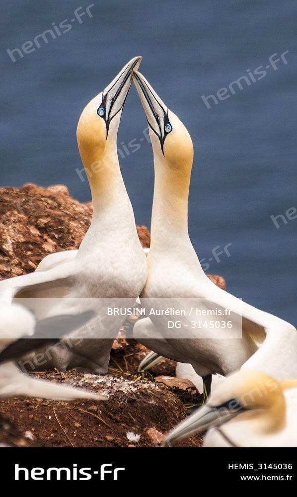 Canada, Province of Quebec, Gaspésie, Île-Bonaventure-et-du-Rocher-Percé National Park, Percé, Northern Gannet colony (Morus bassanus) on the cliff side on Bonaventure island is the largest in the world, with 120,000 congeners, here 2 adults in love parade