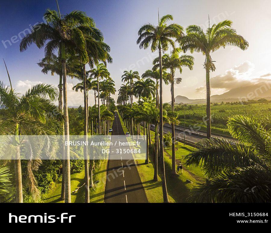 France, Caribbean, Lesser Antilles, Guadeloupe, Basse-Terre, Capesterre-Belle-Eau, aerial view of the Dumanoir alley at sunset, with 430 royal palm trees leading to the domain Marquisat de Brinon in the middle of the XIXth century (aerial view)