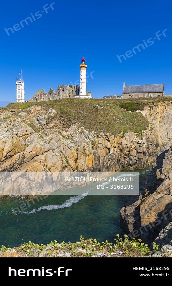 France, Finistère (29), Plougonvelin, la Pointe de Saint-Mathieu, départ du Chemin de Saint-Jacques de Compostelle, le Phare de Saint-Mathieu construit en 1835, l'abbaye Saint-Mathieu de Fine-Terre et le sémaphore de 1906