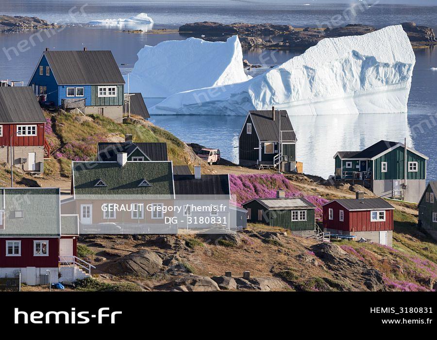 Greenland, Sermersooq, Tasiilaq, view of the town with icebergs