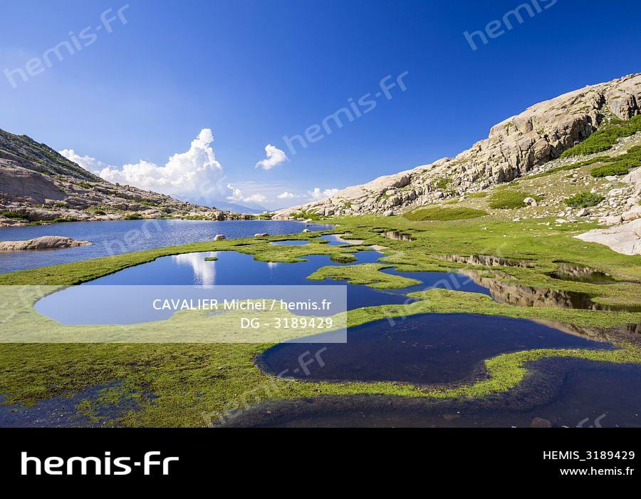 France, Haute-Corse (2B), vallée de la Restonica, '' pozzines '' (ou tourbières) du lac de l'Oriente ou lavu del Oriente (2061m)