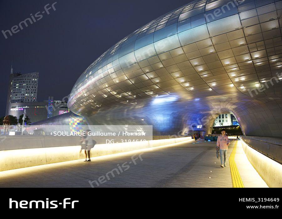 South Korea, Seoul, the Dongdaemun Design Plaza, futuristic building of the architect Zaha Hadid, lit at night