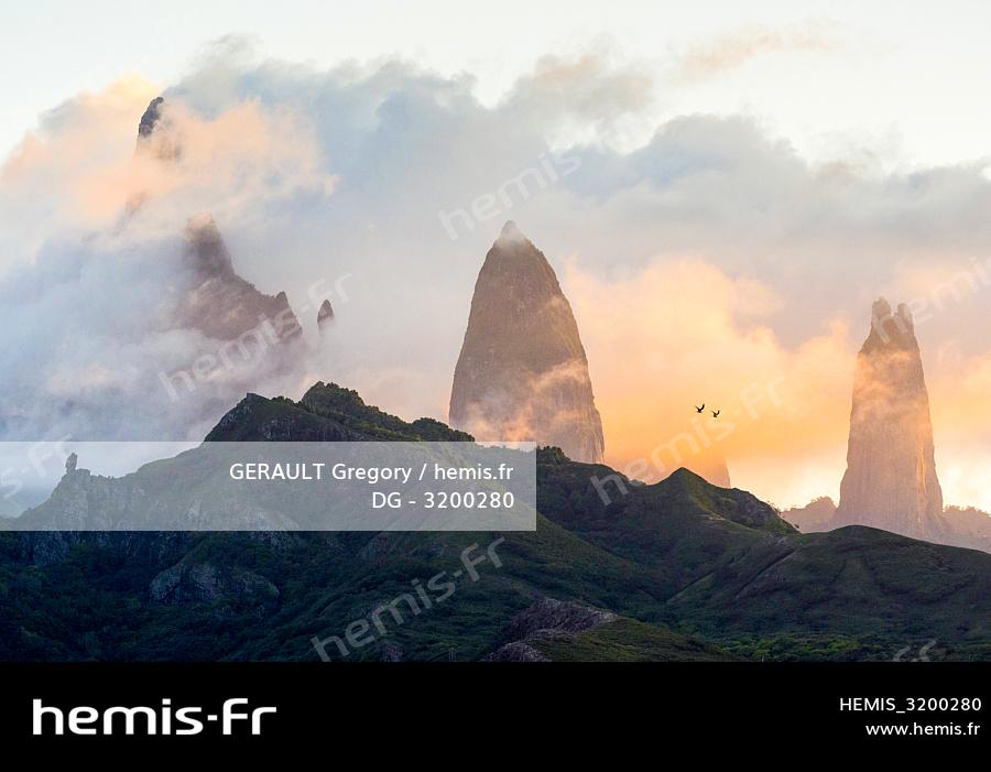 France, Polynésie française, archipel des Marquises classée Patrimoine Mondial de l'UNESCO, île de Ua Pou, Hakahau, coucher de soleil sur les pics de Ua Pou
