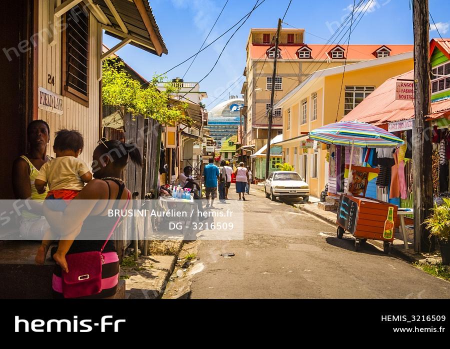 Dominique, capitale Roseau, scène de la vie quotidienne, étalage de rue et grand paquebot de croisière en arrière-plan, depuis le centre-ville