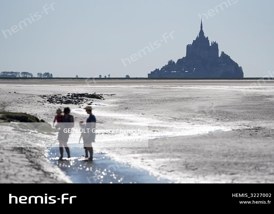 France, Manche, Courtils, site of the Roche Torin, Bay of Mont Saint Michel listed as World Heritage by UNESCO, Abbey of Mont Saint Michel at low tide
