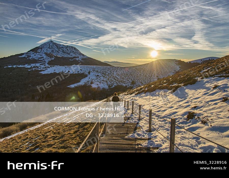 France, Puy de Dome, area listed as World Heritage by UNESCO, Orcines, Regional Natural Park of the Auvergne Volcanoes, the Chaîne des Puys, wooden steps for access to the top of the volcanic cone of the Puy Pariou, the Puy de Dome in the background