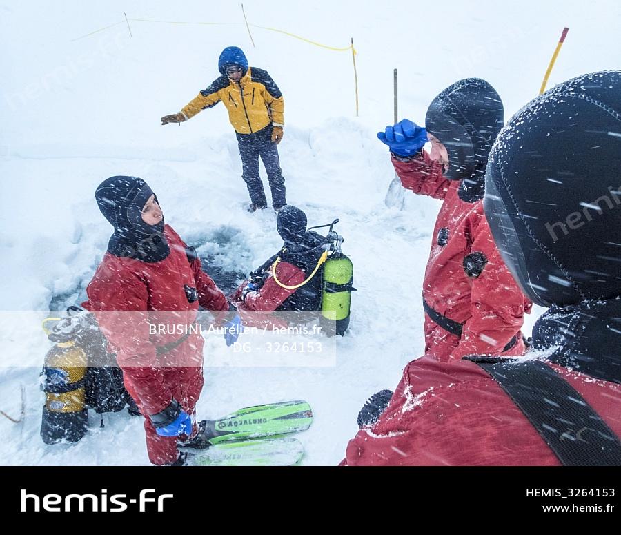 France, Isère (38), Belledonne, Chamrousse, lacs Robert, dernières instructions avant d'enfiler le masque facial pour une plongée sous glace sous une banquise de 2 m d'épaisseur - Dive Xtrême