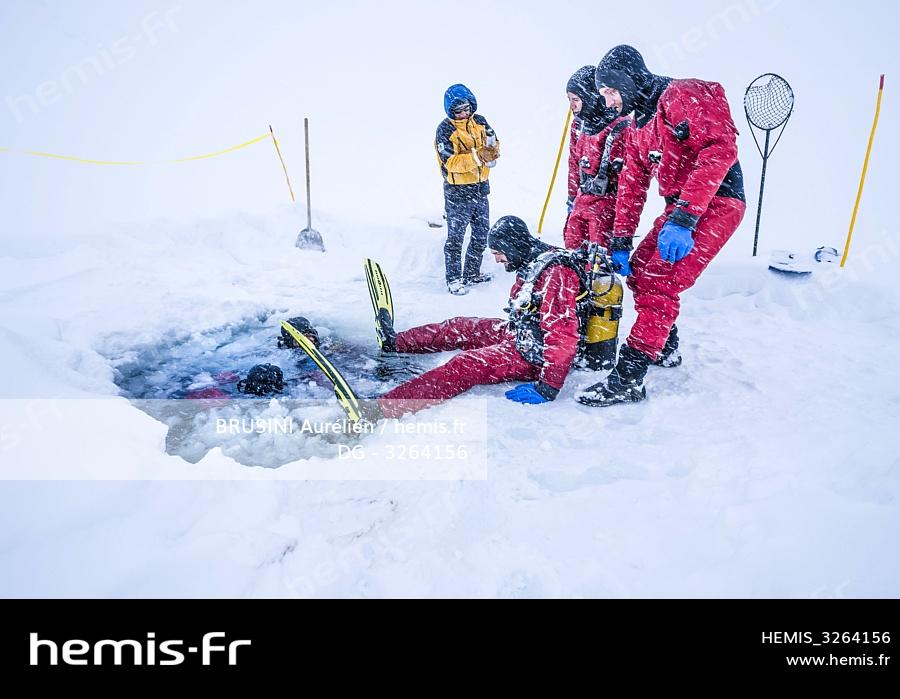 France, Isère (38), Belledonne, Chamrousse, lacs Robert, aide à la remontée d'un plongeur après une plongée sous glace sous la banquise de 2 m d'épaisseur - Dive Xtrême