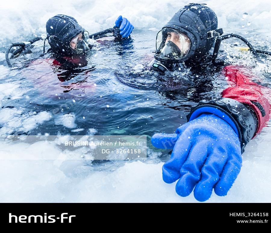 France, Isère (38), Belledonne, Chamrousse, Robert Lakes, a team of divers is preparing to descend under 2 m of pack ice - Dive Xtreme