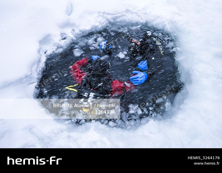 France, Isère (38), Belledonne, Chamrousse, lacs Robert, une équipe de plongeurs remonte par un puits après un plongée sous 2 m de banquise - Dive Xtrême