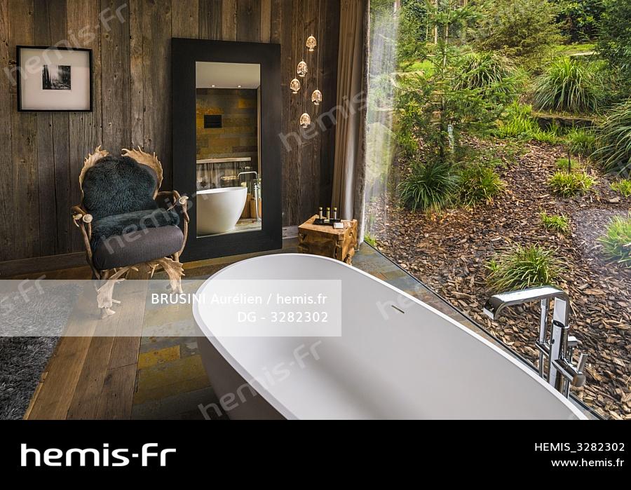 France, Sarthe, La Fleche, La Fleche Zoo, unusual family accommodation at Beaver Creek Lodge for an intimate face to face with Kamchatka bear (Ursus arctos beringianus), here in the parental suite