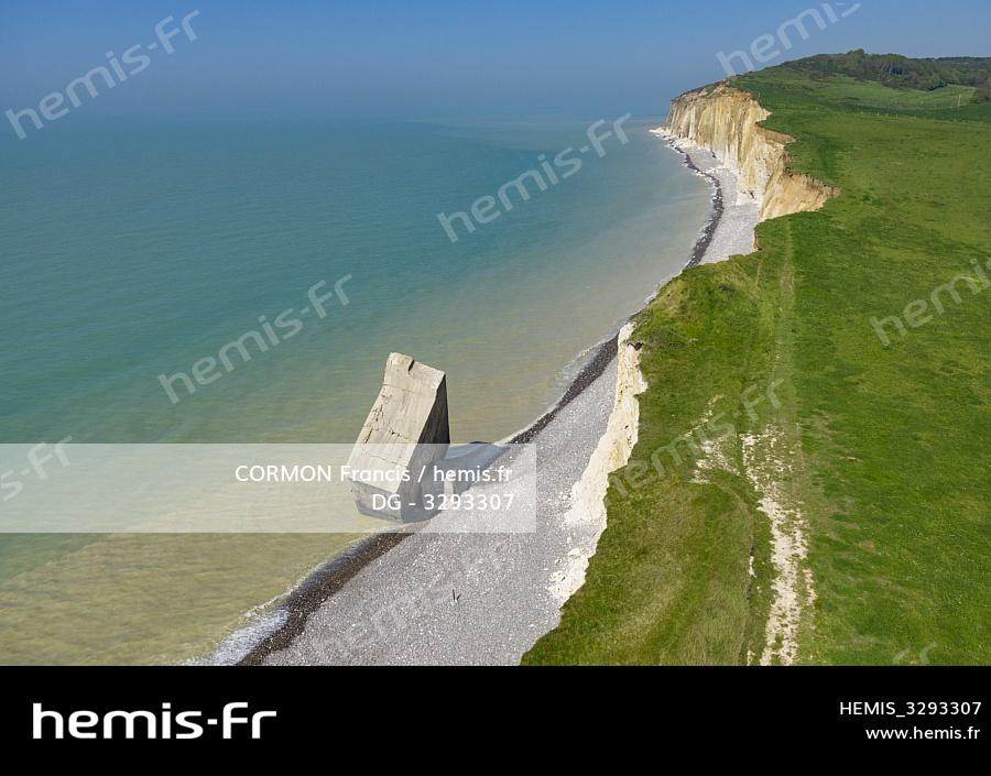 France, Seine-Maritime, Sainte Marguerite sur Mer, bunker fell from the cliff and planted in the beach (aerial view)