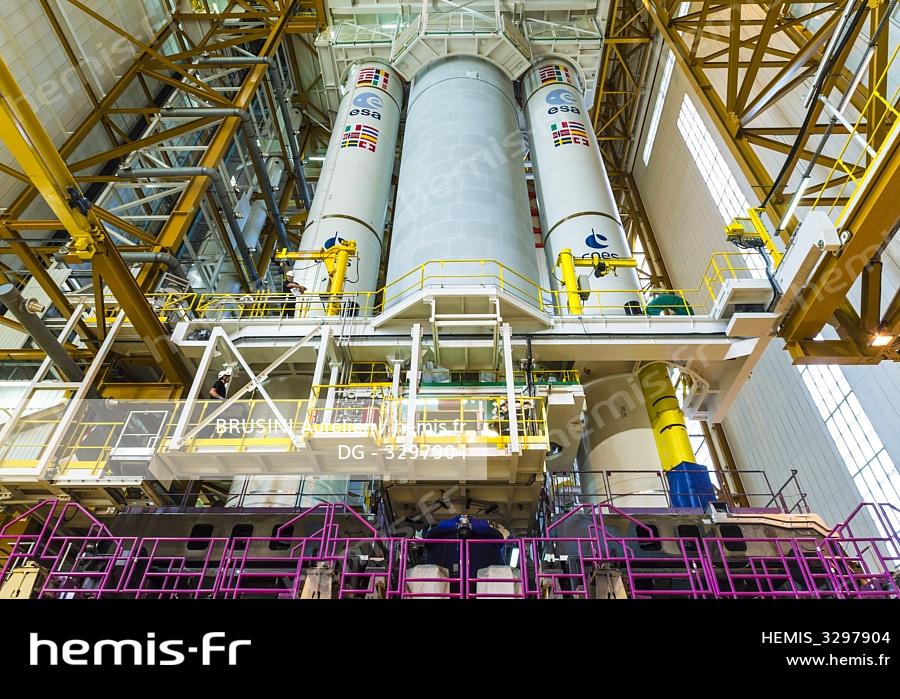 France, French Guiana, Kourou, Guiana Space Center (CSG), Ariane V rocket on the assembly table, during a mounting campaign inside the Launcher Integration Building (BIL)