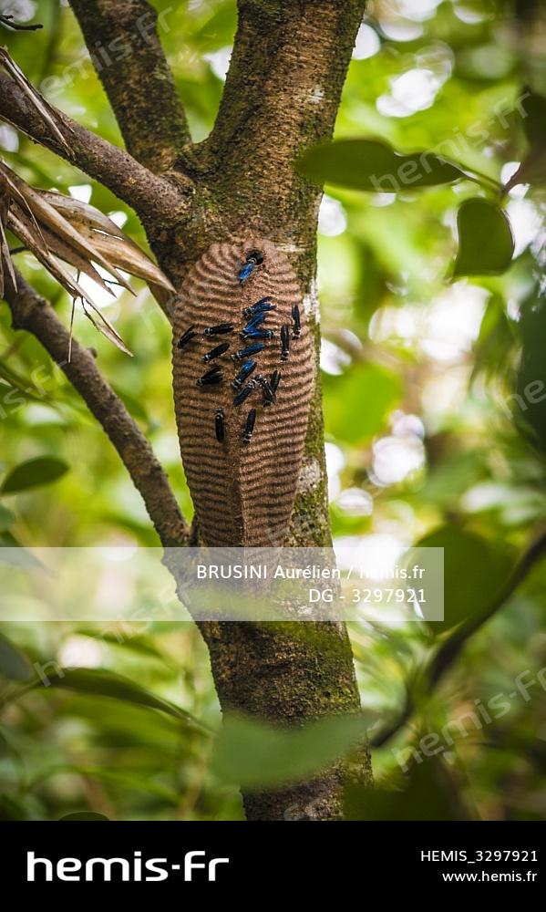 France, French Guiana, Kourou, Guiana Space Center (CSG), nest of tatoo-wasps, quiet insects with painful sting, in one of the protected forests located within the enclosure of the Guiana Space Center