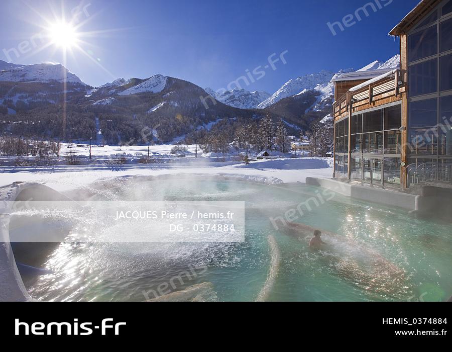 France, Hautes-Alpes (05), Serre Chevalier, vallée de La Guisane, Le Monêtier-les-Bains, Les Grand Bains du Monêtier, piscine d'eau thermale chauffée