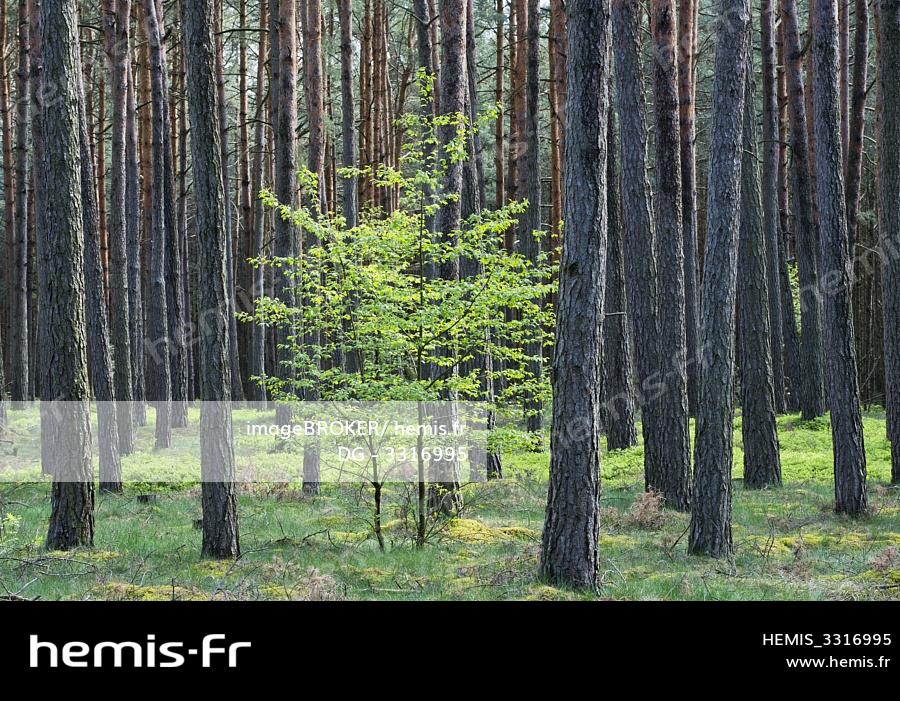 Petit arbre à feuilles caduques entre les troncs d'arbres, forêt de pins-Pinus sylvestris-, Brandebourg, Allemagne, Europe
