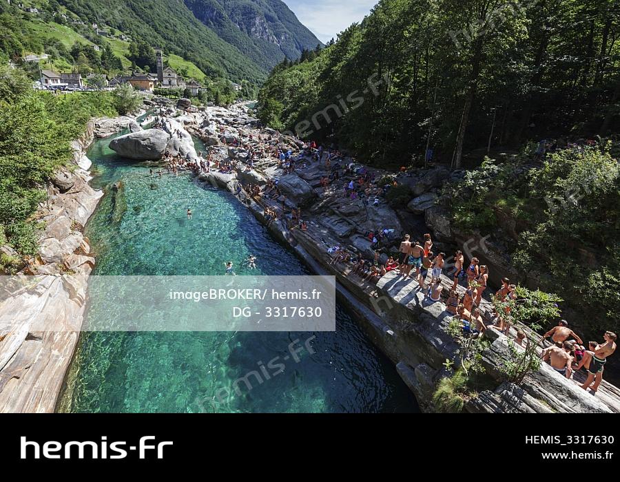 Personnes se baignant sur des rochers à Verzasca, près de Lavertezzo, Verzascatal, Valle Verzasca, Canton du Tessin, Suisse, Europe