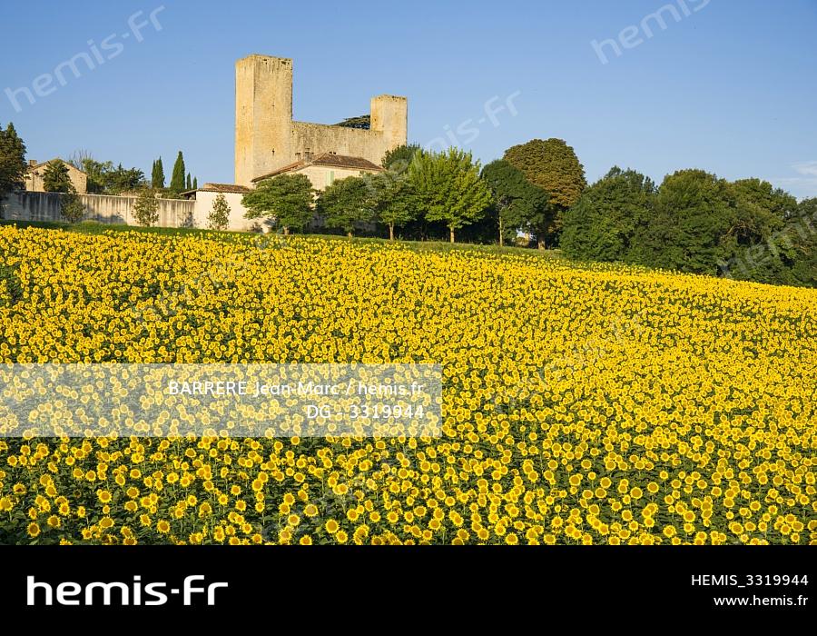 France, Gers , Sainte Mere, Sainte-Mère castle and sunflower field