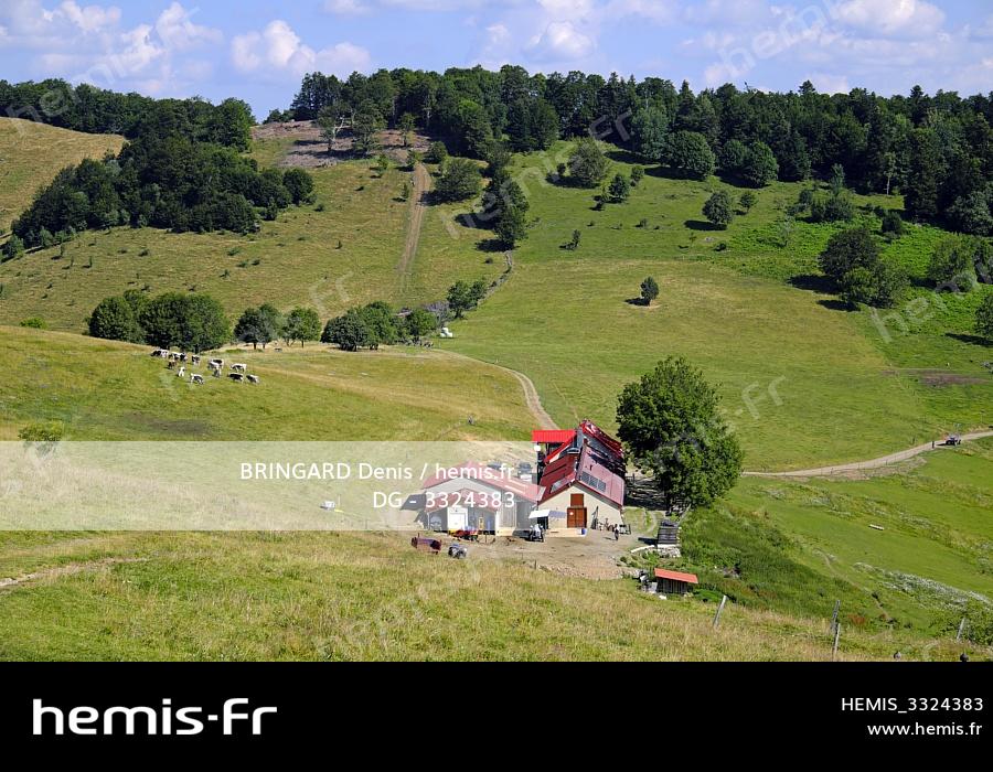 France, Haut Rhin, Hautes Vosges, Rossberg massif, Belacker meadow, Belacker farm and inn, gîte, Vosges cows, view of Vogelsteine