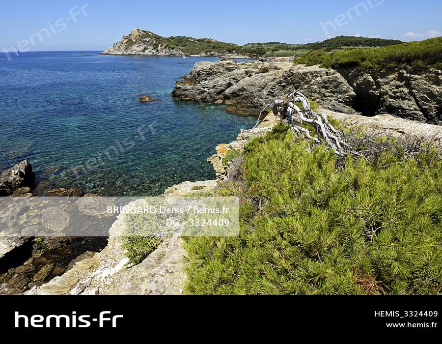 France, Var (83), Six-Fours-les-Plages, Le Brusc, presqu'île du Gaou, Pin d'Alep (Pinus halepensis) couché par le vent, vue sur l'île des Embiez