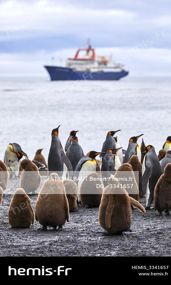 France, French Southern and Antarctic Territories (TAAF), Crozet Islands, Ile de la Possession (Possession Island), King Penguin (Aptenodytes Patagonicus) at the Penguin Rookery at the Baie du Marin with the Marion Dufresne (supply ship of French Southern and Antarctic Territories), at anchor in the Baie
