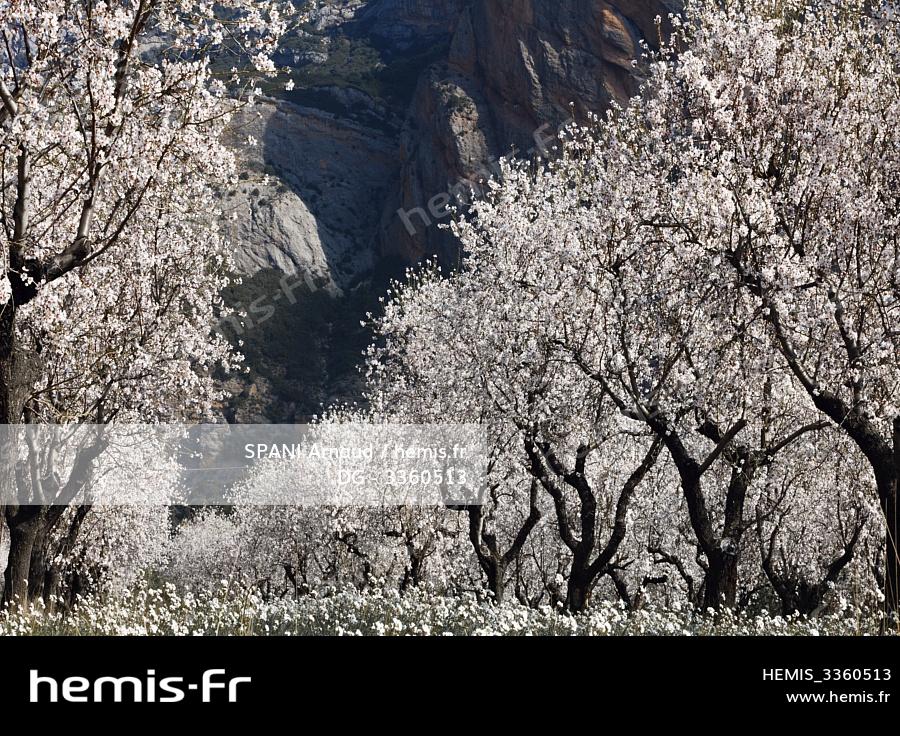 Espagne, Aragon, Huesca, Riglos,cerisiers aet amandiers en fleurs dans une plaine agricole Modifier