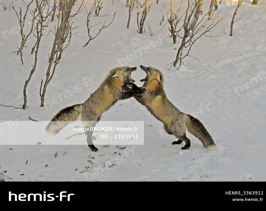 Deux renards croisés, variante canadienne du renard roux -Vulpes vulpes-, se battant en duel dans la neige devant la proie, Yukon, Canada, Amérique du Nord