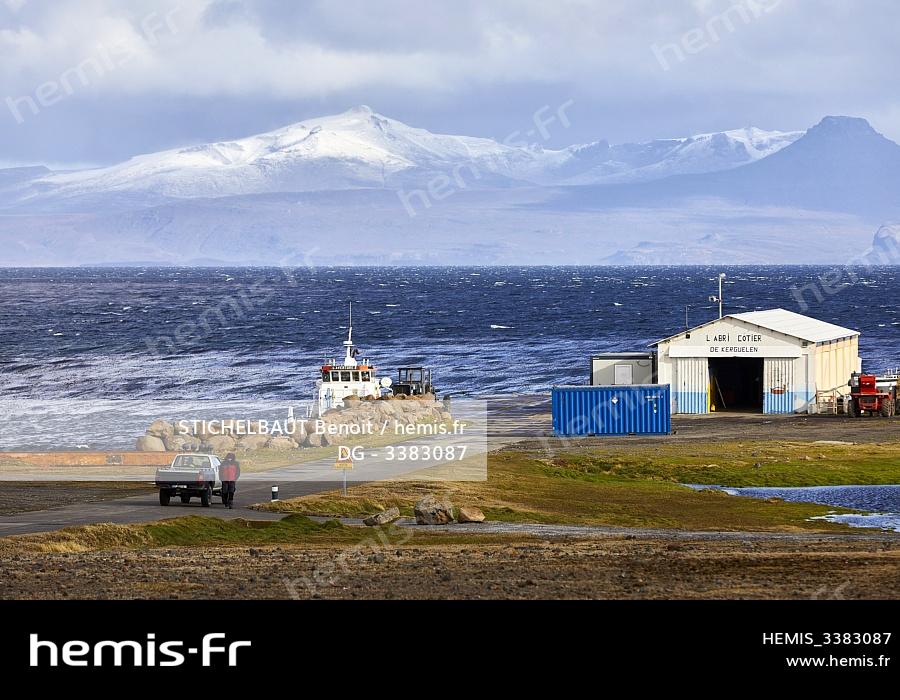 France, French Southern and Antarctic Territories (TAAF), Kerguelen Islands, the Port-aux-Français building with the Ronac'h peninsula in the background, The Adventure Barge II, the only boat on the island, is moored in the hold, The flotilla building (local divers, mechanic's workshop, office and bosco workshop) was ironically called "The Coastal Shelter"
