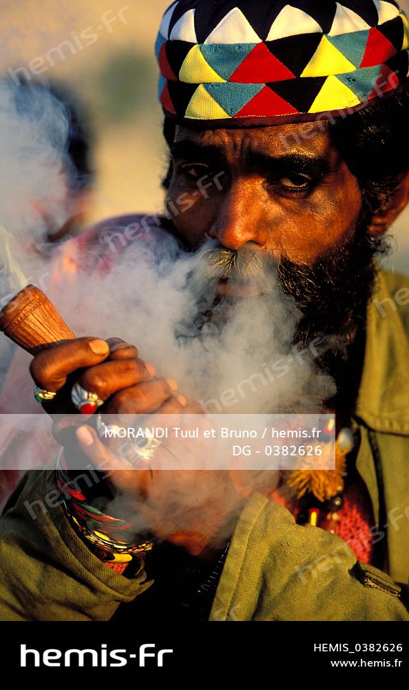 Pakistan, provinces du Sind et du Balouchistan, pèlerinage soufi de Lahoot, fête soufi, un Malang fume son Shilum rempli de sharas, nom local du hashish