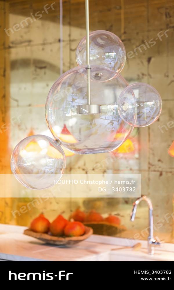 Belgique, Bruxelles, insolite métissage décoration cuisine lustre verre transparence