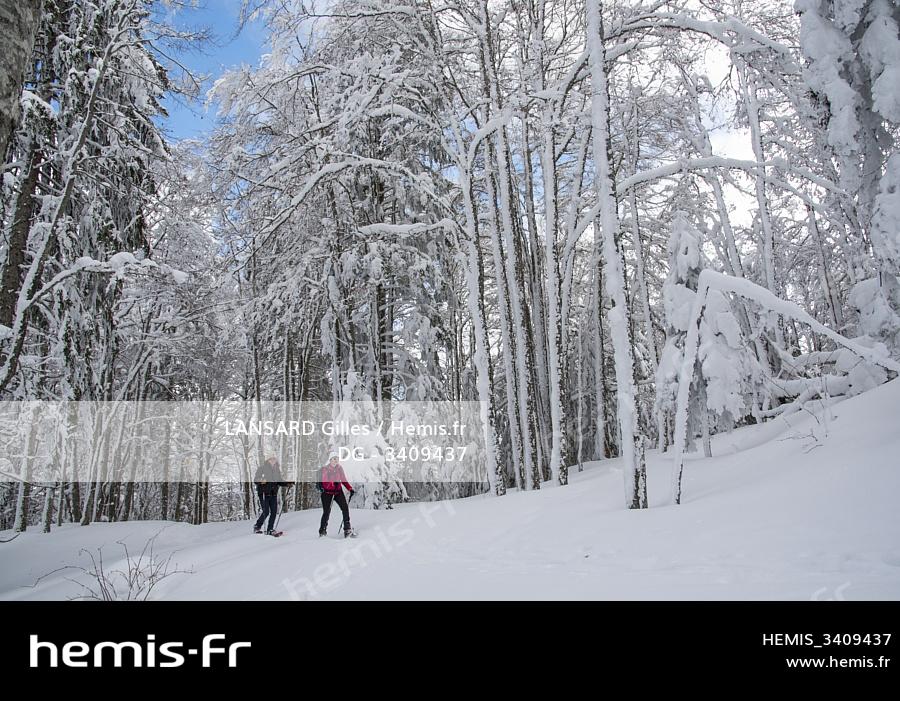 France, Jura, GTJ great crossing of the Jura on snowshoes, a forest full of snow on the side of the Bretta
