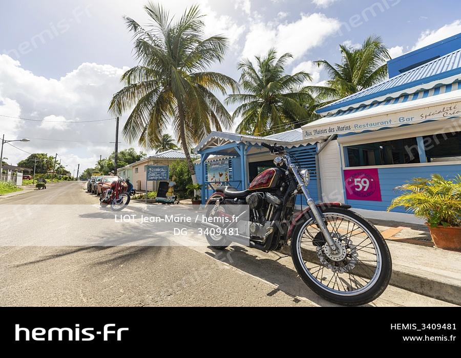 France, Guadeloupe, Marie Galante, Saint Louis, Anse Canot, front of the restaurant to the pleasure of the sailors, in the foreground Harley Davidson parked