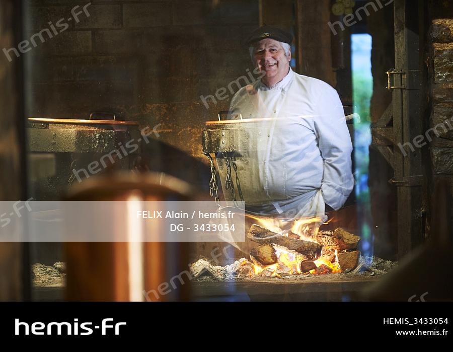 France, Aveyron, Monteils, The Farm of Carles, portrait of Jacques Carles, cooking over a wood fire in copper cauldrons, neck of duck stuffed with foie gras