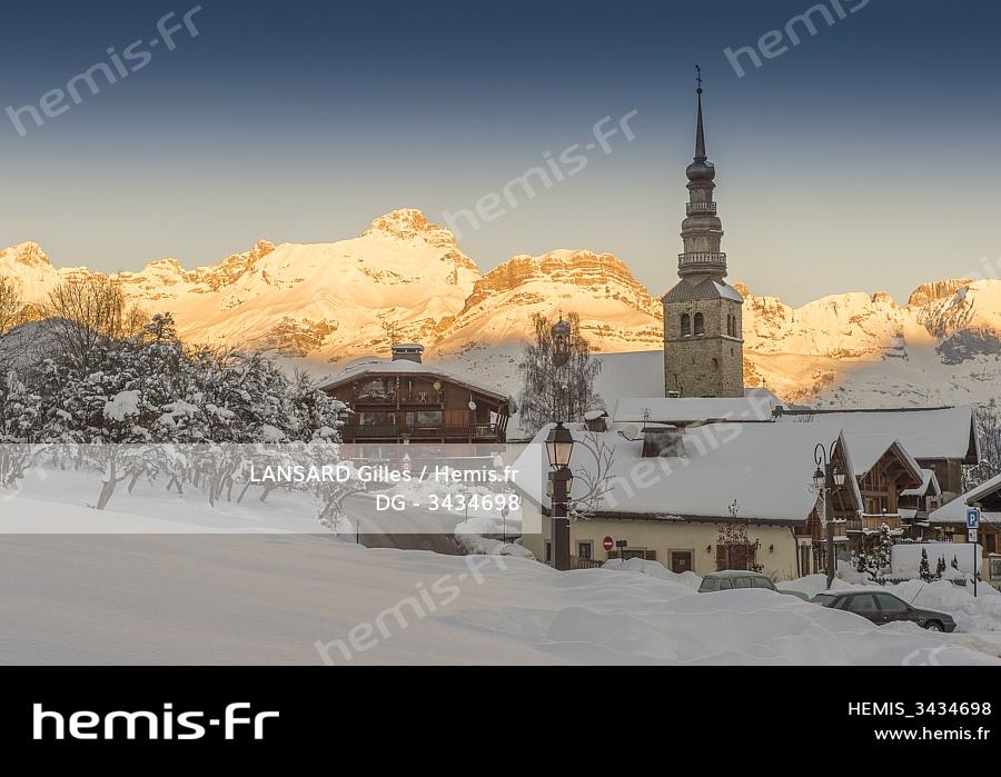 France, Haute Savoie, Alps, Mont Blanc country, Combloux, village and Saint Nicolas church in front of sunrise on the Aravis massif with Percée Point