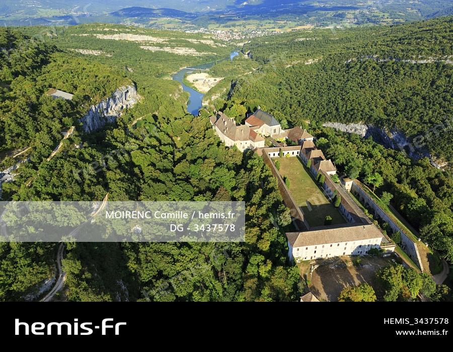 France, Ain (01), Virignin, Chartreuse Forteresse de Pierre Châtel XIIe, Le Rhône (vue aérienne)