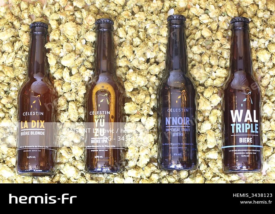 France, Nord (59), Lille, vieux-Lille, rue Jean-Jacques Rousseau, micro-brasserie Célestin, les 4 bières produites sur place (blonde, IPA, impérial Stout et Triple) sur un lit de houblon régional