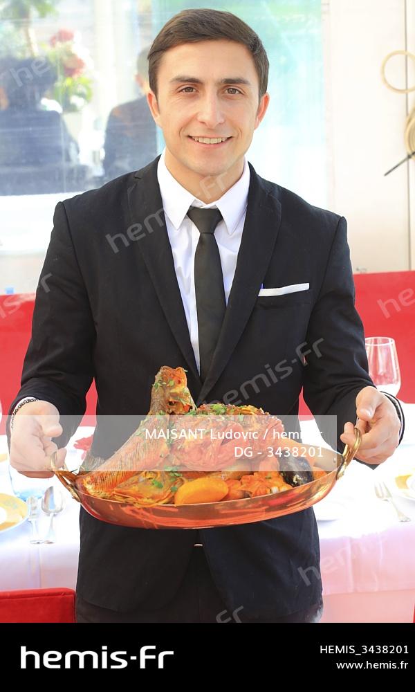France, Bouches-du-Rhône (13), Marseille, Vieux-Port, restaurant Miramar, serveur avec une bouillabaisse